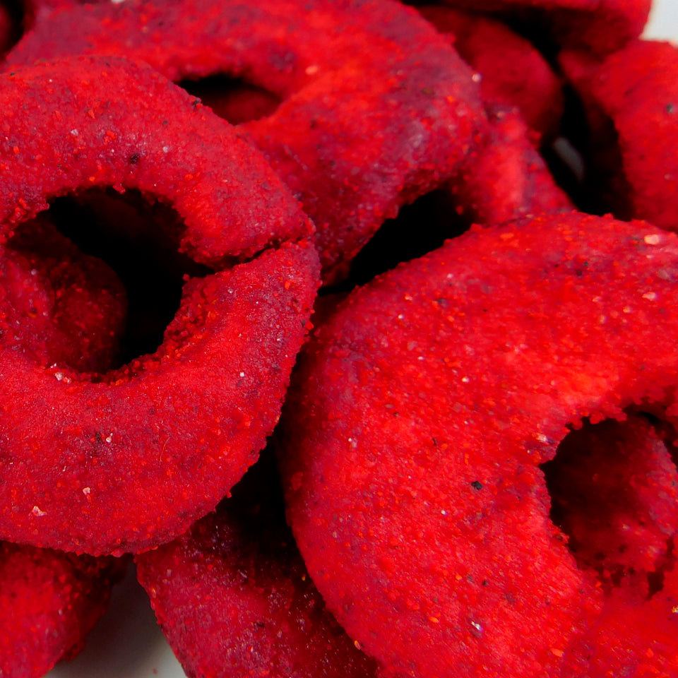 DescripciónTiras de manzana deshidratada con cobertura de chile tipo chamoy, de color rojo intenso.